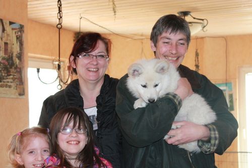 Bilder undOje, das war vielleicht ein aufregender Tag !!! Fing ja morgens fast normal wie immer an, obwohl ich irgendwie doch 4 meiner Brüder etwas vermisse, die schon vor 2 Tagen zu ihren neuen Frauchens und Herrchens gezogen sind. So gegen 10:30 Uhr kam dann mal wieder Besuch, eigentlich auch nichts neues, aber immer wieder spannend. Diesmal jedoch war nämlich alles anders. Denn diesmal war das mein Frauchen Silke mit ihrer Freundin Maria und deren beiden süßen Mädels Madita und Malina. Ich mochte die alle gleich furchtbar gerne, aber dann war es doch etwas komisch, dals ich mein Wurfrudel und meine Zieheltern Manuela und Dirk verlassen musste. Auf der Autofahrt in mein neues Heim habe ich dann am Anfang auch etwas geweint, aber irgendwie war dann doch alles okay.